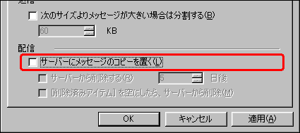 「最近受信に時間がかかる…」「メールがすぐいっぱいになる…」そんなときはサーバに保存する設定になっていないか確認してみましょう。 ● 設定例 - Outlook Express - ● ( ツール ⇒ アカウント ⇒ プロパティ ⇒ 詳細設定タブ )