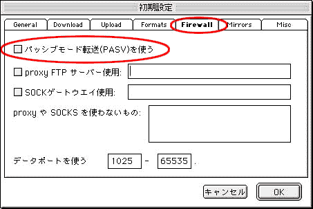 このウィンドウの「パッシブモード転送(PASV)を使う」にチェックを入れてください。