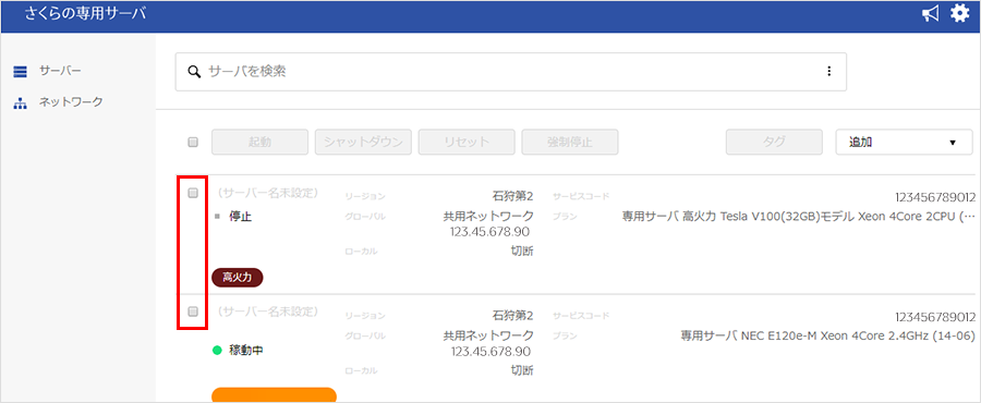 2タグを付与したいサーバーサービスの、各サーバー名称の左側にあるチェックボックスにチェックをいれます。