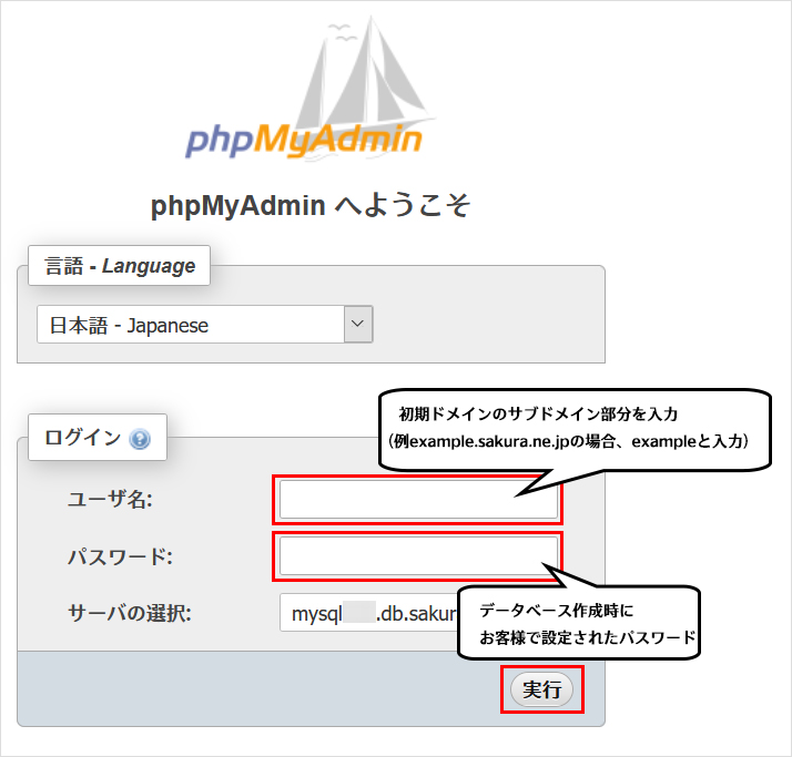 ユーザ名 | 初期ドメインのサブドメイン部分 (例:初期ドメインが example.sakura.ne.jpの場合、exampleと入力) |