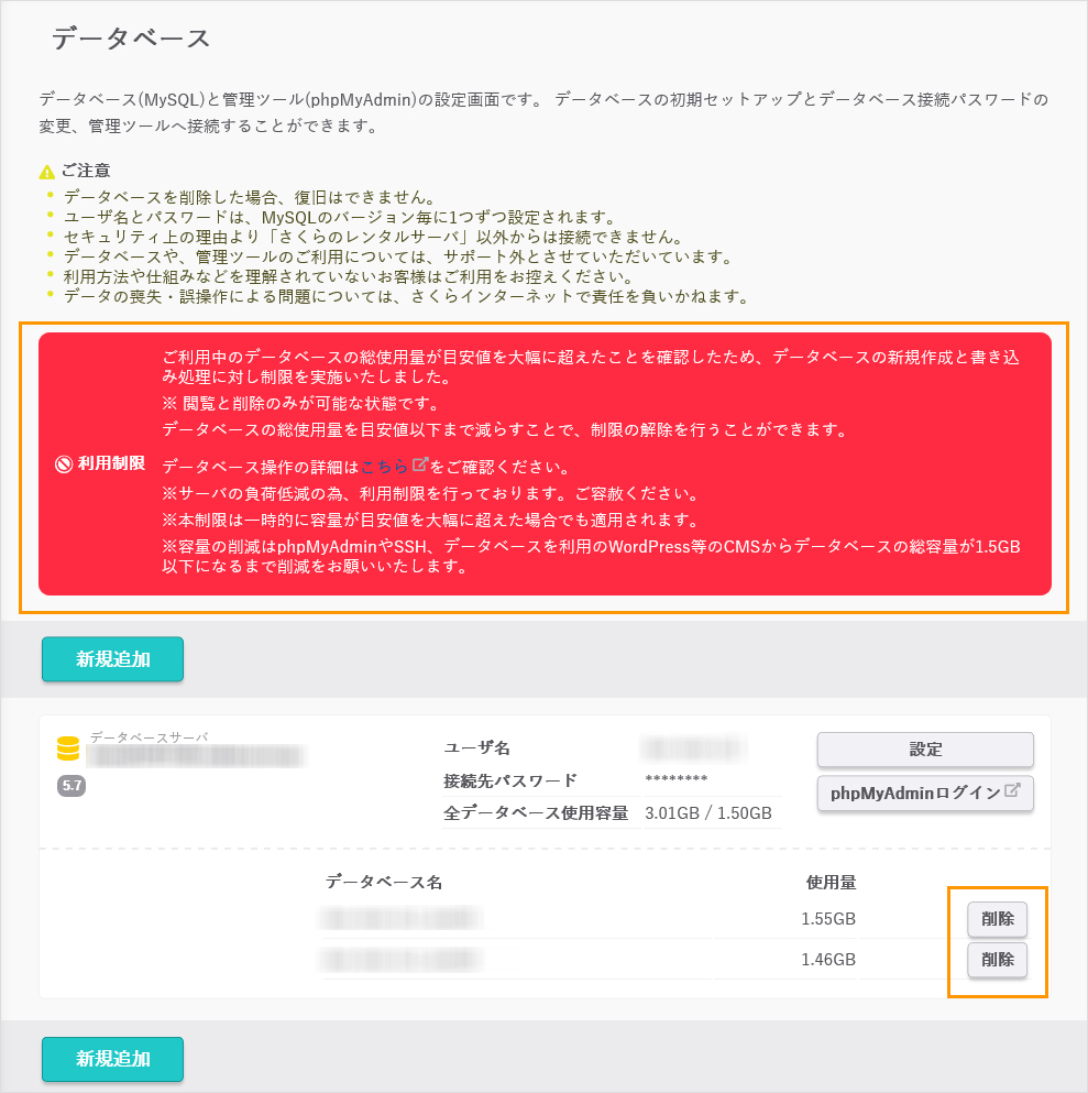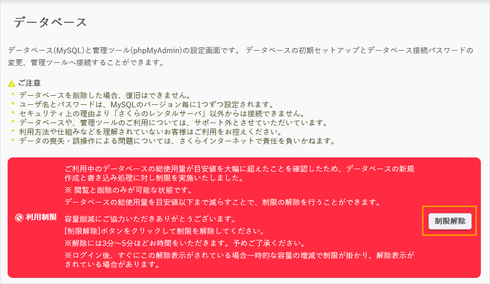 ※上記総使用量は、MySQL5.7が対象となります。 - 解除を行うには、データベースの使用容量を目安容量内に収まるようにお客様側で調整していただく必要がございます。