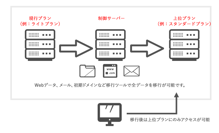 プラン変更申し込み後、自動的に上位プランのサーバーへデータが移行され、旧プランサーバーへのアクセスができなくなります。- この際、初期ドメイン・サービスコード・支払方法が引き継がれます。