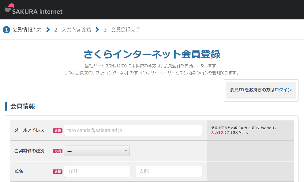 画面に従ってさくらインターネット会員ID登録手続きを行います。