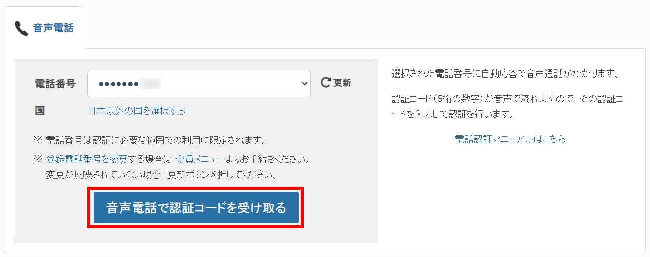 「音声電話で認証コードを受け取る」ボタンをクリックすると登録している電話番号宛てに電話が着信し、自動音声で認証コードが再生されます。この画面内に聞き取った認証コードを入力し、「認証」ボタンをクリックすることで認証が完了します。