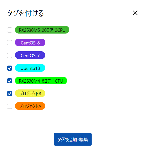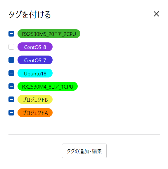 タグの「追加」「編集」「削除」や、作成したタグを「サーバー」「ネットワーク」「アプライアンス」に付け外しすることができます。