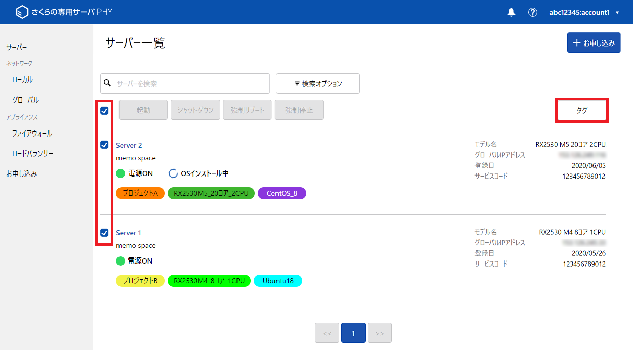 タグの左側のチェックボックスをクリックすることで、選択しているサーバーサービスに対し一括で付与や解除が行えます。