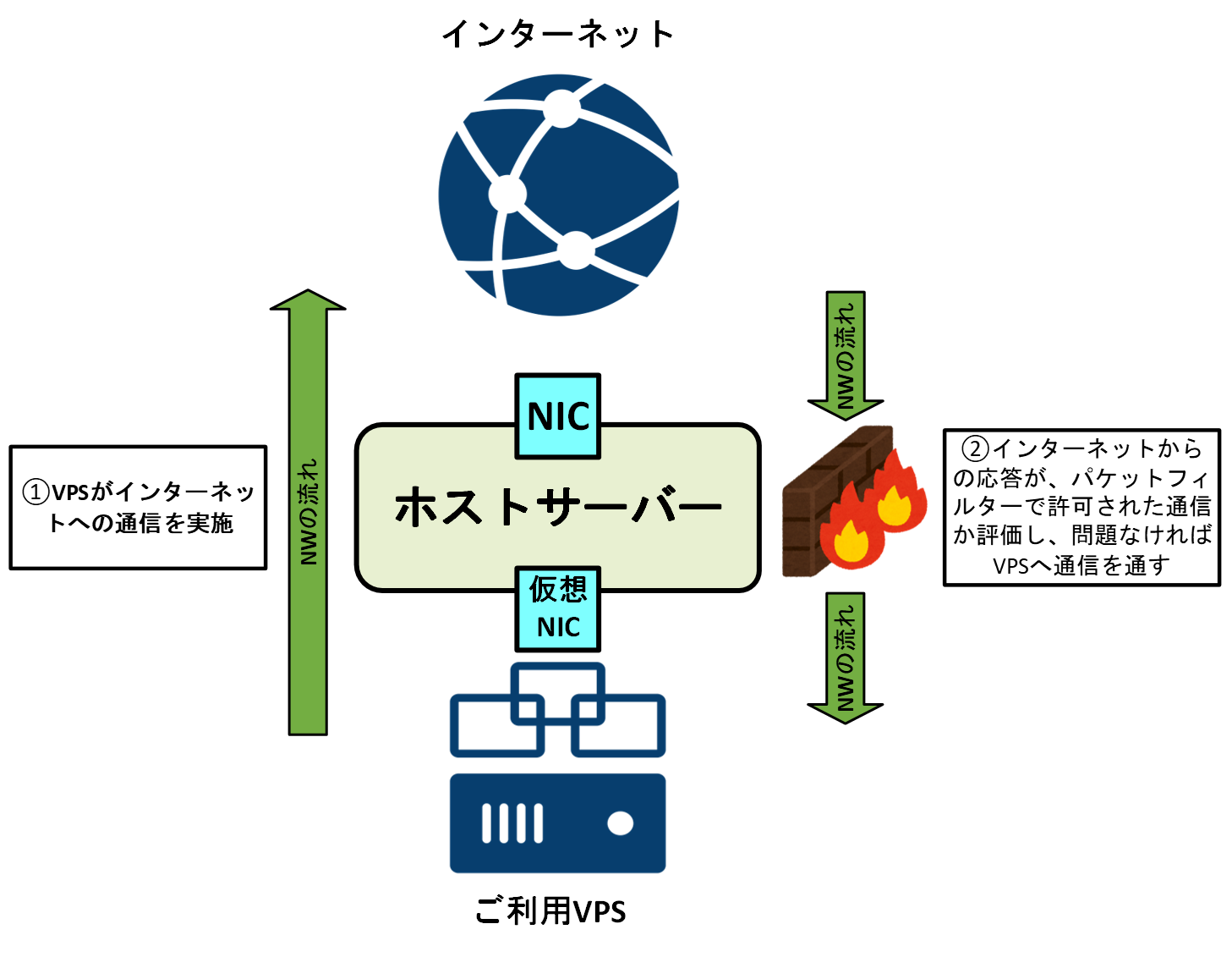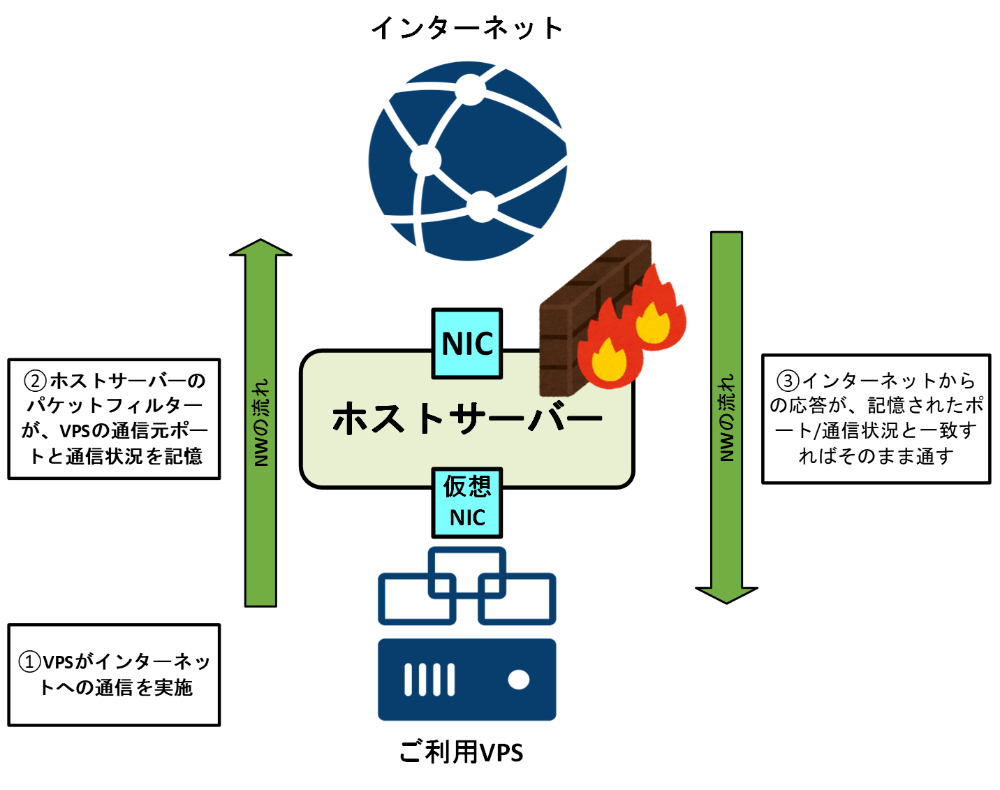 さくらのVPSで提供しているパケットフィルター機能は、お客様収容中のホストサーバーのコンピューティングリソースを公平にご利用いただけるように、「ステートレス」での機能提供をしております。