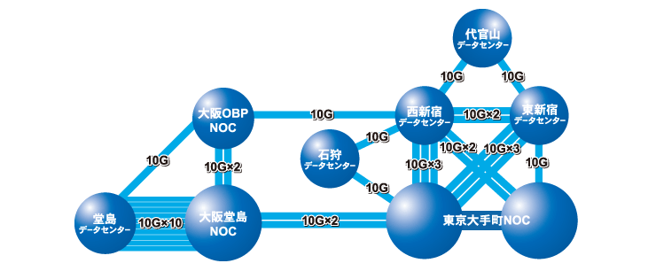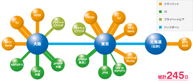 国内最大級の規模となるさくらインターネットのバックボーンネットワークは、日本国内の代表的なIXや数多くの大手ISPと東京・大阪で接続を行い、高い 可用性と圧倒的なトラフィック配信能力を実現しています。対外接続の総計は、データセンター専業事業者としては最大となる244Gbps。各データセンター間もギガビット以上で接続されています。